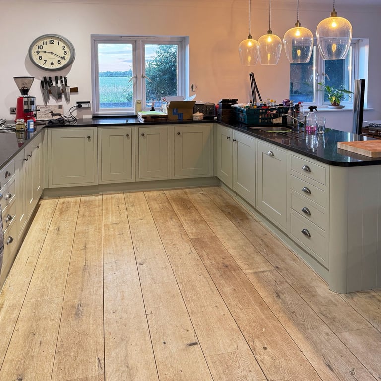We gave a tired wooden kitchen a fresh new life with a light olive repaint.