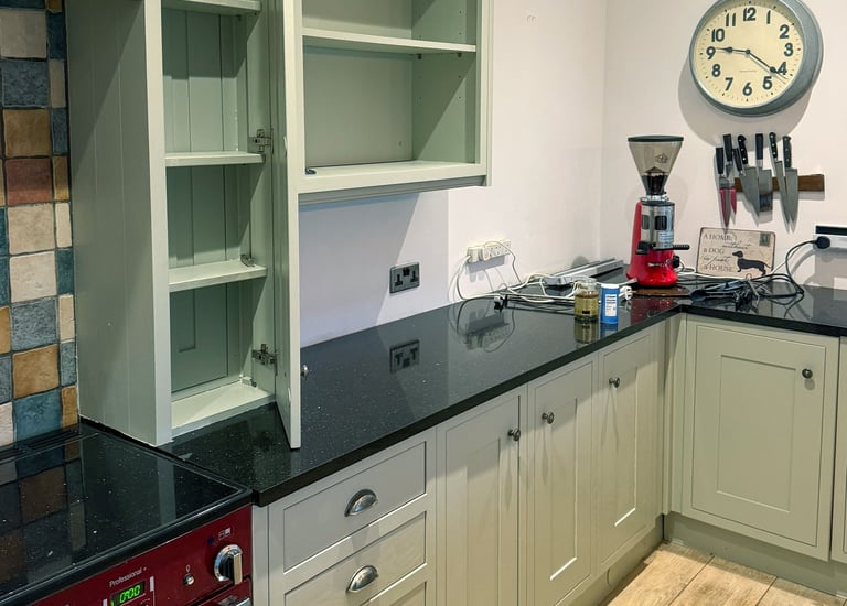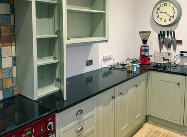 We gave a tired wooden kitchen a fresh new life with a light olive repaint.